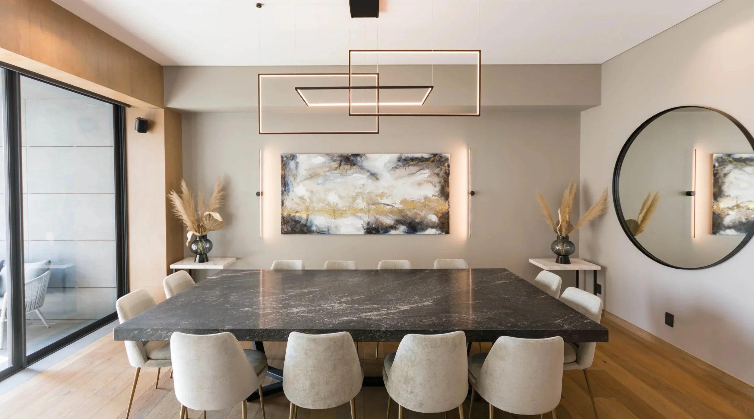 Cada espacio fue concebido para mantener una continuidad material y cromática, eliminando transiciones innecesarias y privilegiando la fluidez espacial. Esta lógica se extiende al mobiliario: piezas de líneas rectas, tonos neutros y proporciones contenidas que se integran con discreción al entorno, sin competir con los materiales ni con la arquitectura.