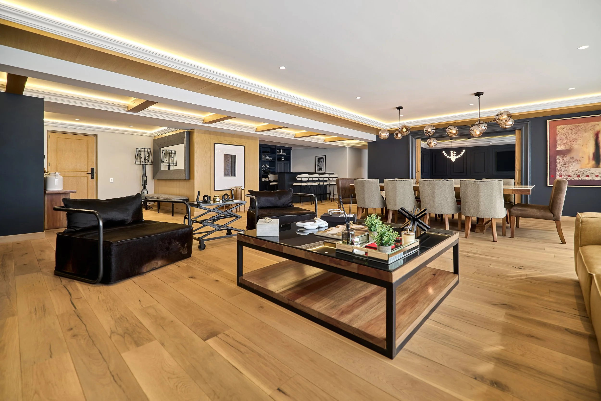 The transitions between social and private areas are resolved with clean lines and visual continuity that unifies the entire project. The color palette combines natural wood, neutral tones, and dark accents, creating depth and sophistication without sacrificing warmth.
