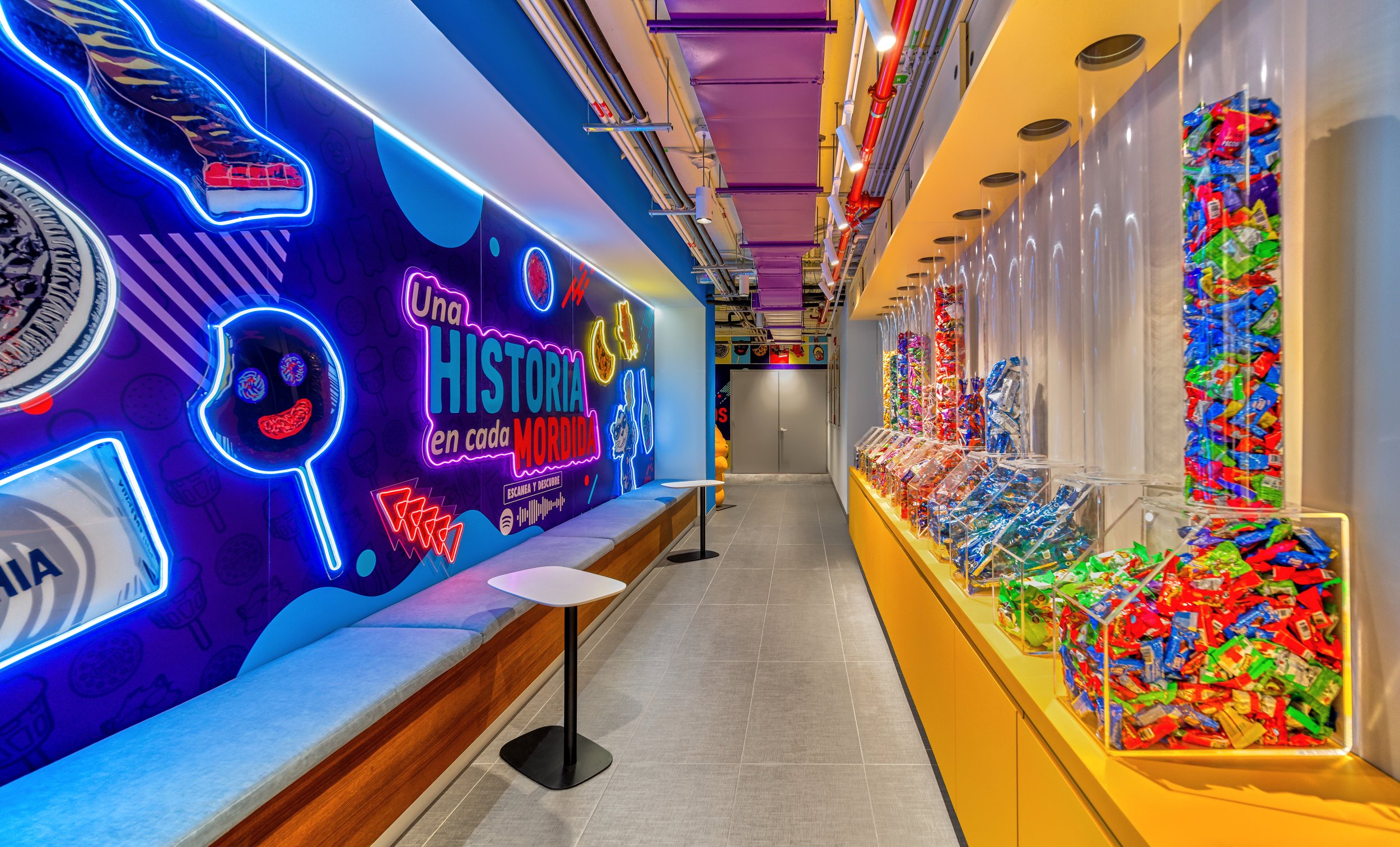 Cada detalle del espacio fue cuidadosamente concebido para resaltar las distintas marcas y valores de Mondelez, asegurando que quienes lo visiten no solo vean la innovación, sino que la sientan y la experimenten. El diseño integra áreas interactivas y colaborativas que invitan a explorar, crear y participar activamente en el proceso de desarrollo de productos.
