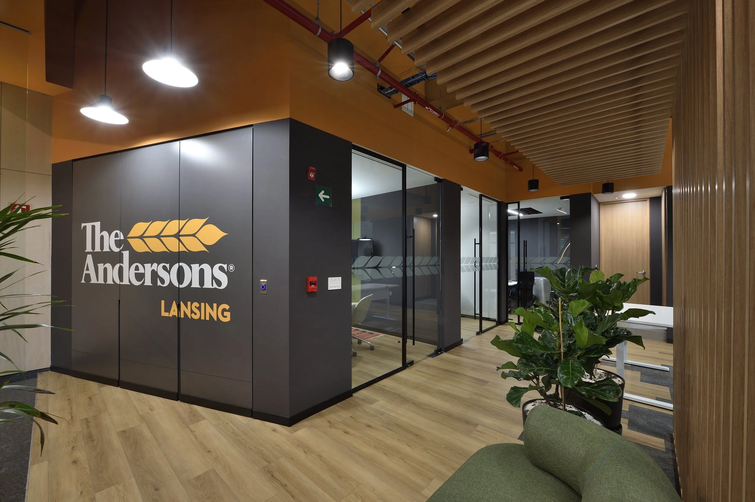 El diseño de las oficinas de The Andersons Trade Group en Lansing parte de una estética industrial, conservando el plafón expuesto y elementos estructurales visibles como parte del carácter del espacio. Estos se equilibran con detalles en madera y una paleta neutra que aporta calidez.